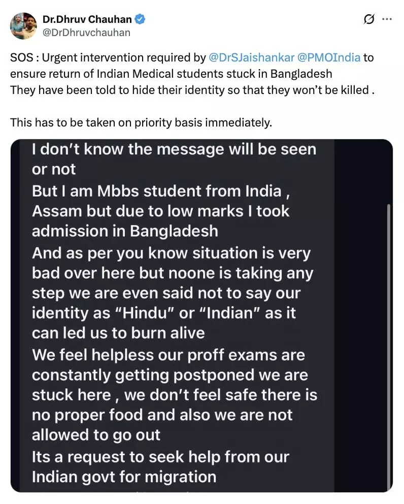 “SOS : Urgent intervention required by@DrSJaishankar@PMOIndia to ensure return of Indian Medical students stuck in Bangladesh They have been told to hide their identity so that they won’t be killed . This has to be taken on priority basis immediately,” Dr. Chauhan mentioned in an X post, sharing the message of an Indian student in Bangladesh.